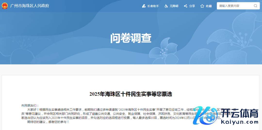 把柄民生实事遴择干系职责条目,前期海珠区通过多种渠说念就“2025年海珠区十件民生实事”开展了概念询查职责,经梳理分类社会公众、区“两代表一委员”等概念提出,并会同区干系部门共同操办,变成了涵盖全球交通、全球安全、做事保险、社会保险、济困扶危、文化闇练等民生界限的16件票选事项。现请众人选出您觉得应该列入2025年十件民生实事的技俩,并勾选对应的选项框进行投票,每东说念主接受10项,票选时刻为2024年12月11日至2024年12月13日。