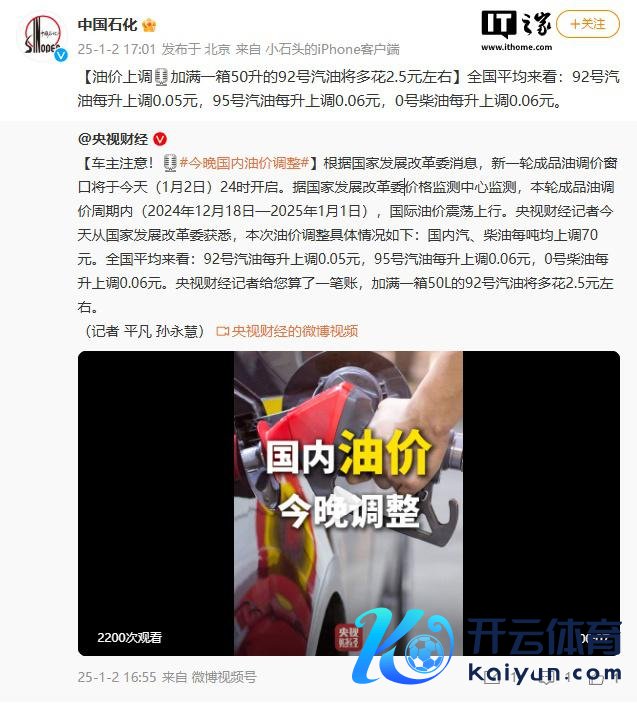 IT 之家 1 月 2 日音信,国度发改委刚刚发晓谕知,宣布今晚进行油价调遣开云kaiyun官方网站,也即是 2025 新年"第一涨"。
