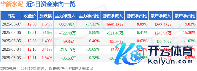本站音信,截止2025年3月7日收盘,华新水泥(600801)报收于12.5元,高潮1.54%,换手率1.23%,成交量16.51万手开云kaiyun官方网站,成交额2.06亿元。